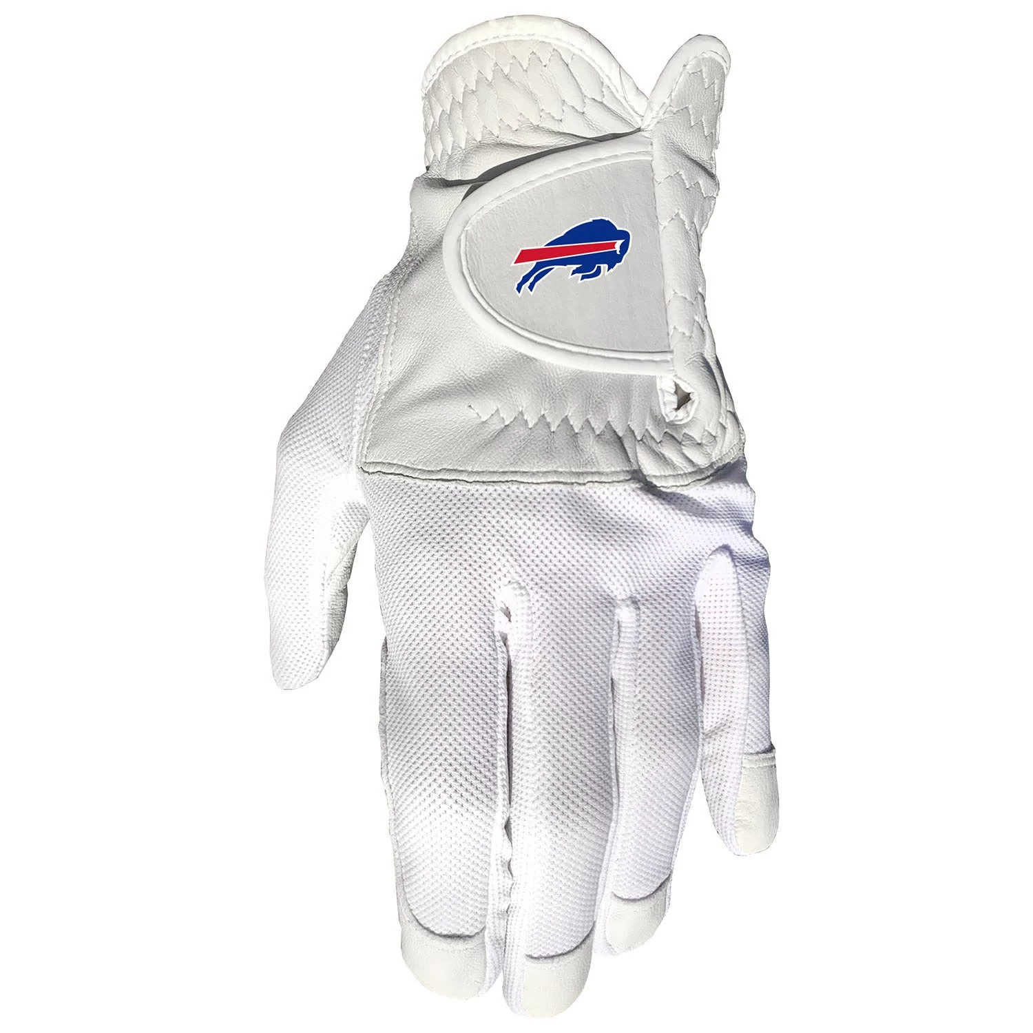 This single fit glove features a cool mesh material for comfortable fit, along with 100% cabretta leather palm and finger tips. Crisp Buffalo Bills digital imprint on the glove closure.