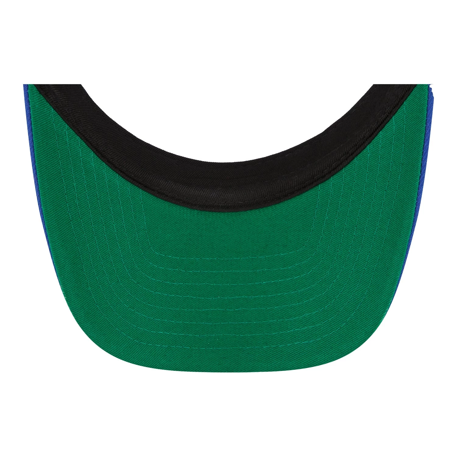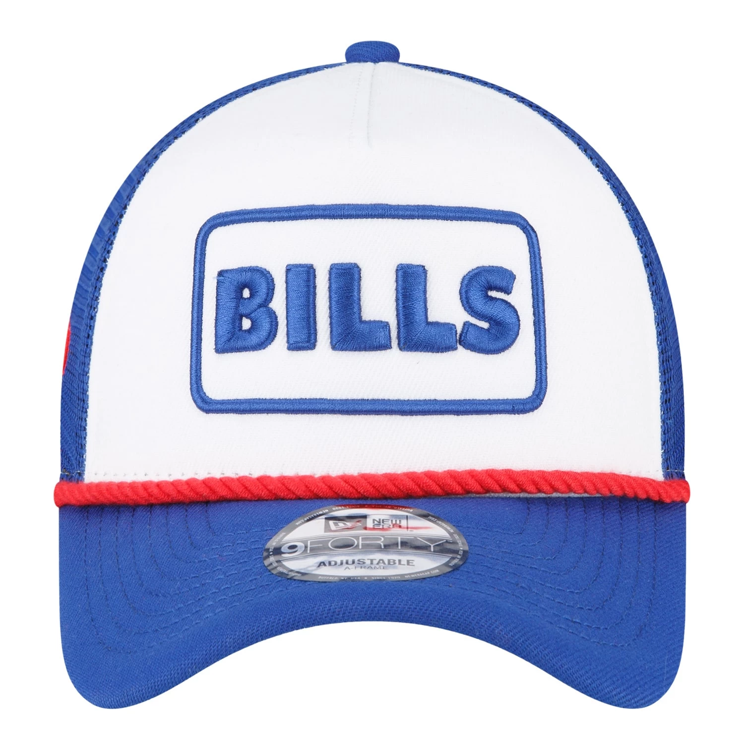The Bills 9FORTY A-Frame Trucker features an embroidered Bills logo at the front panels with an adjustable snapback closure at the rear and a green under visor.
