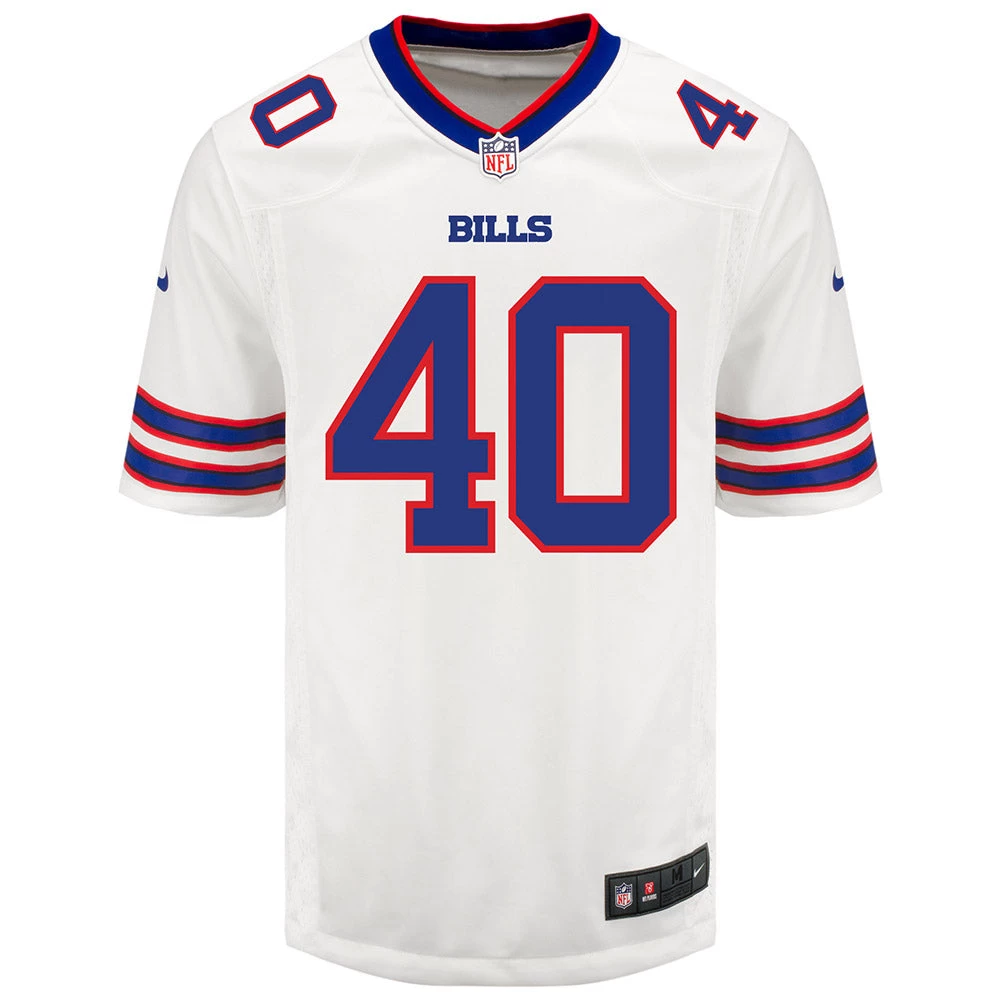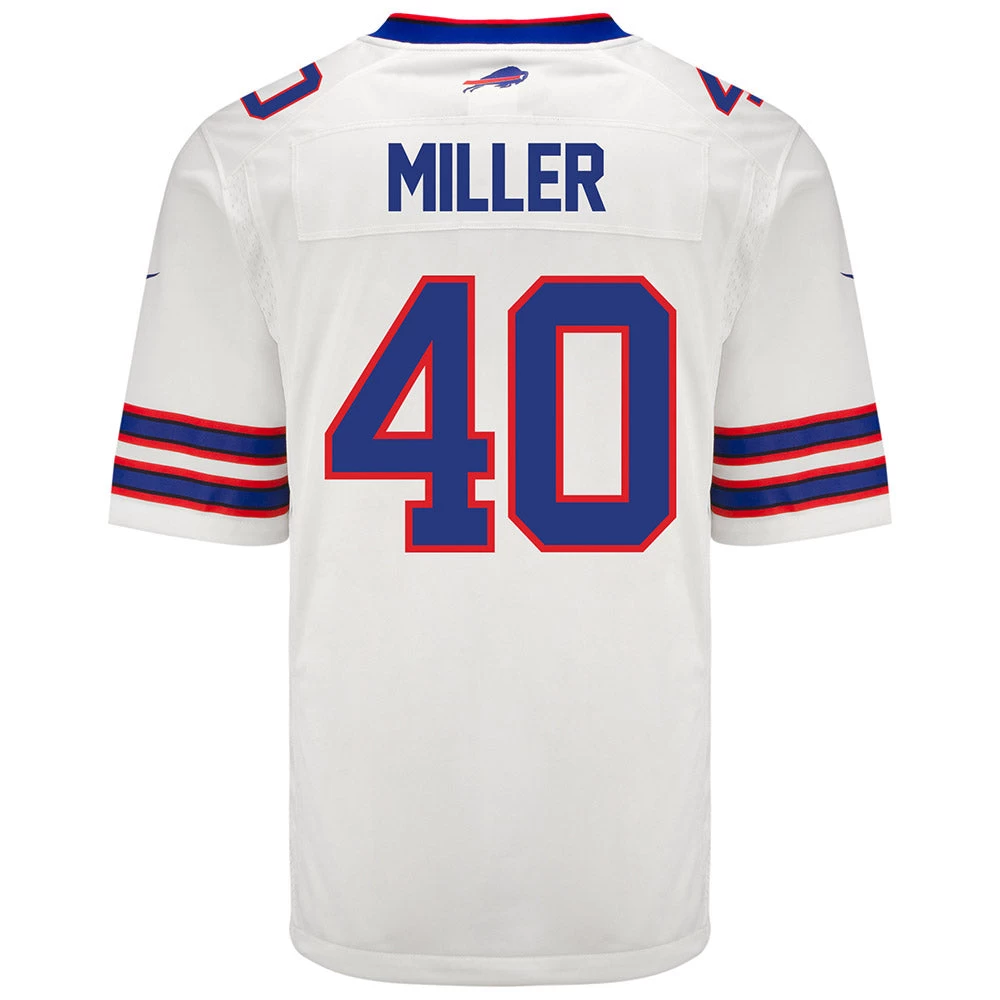 Turn dreams into reality while expressing ultimate fan loyalty today with this Nike Away Von Miller Jersey. This officially licensed NFL replica jersey was created to provide today’s elite athlete with maximum comfort while competing on football’s highest playing field. It features a no-tag neck label for clean comfort, a tailored fit design for movement, and silicon print numbers for a light and soft feel. Made of 100% polyester. This Buffalo Bills Nike NFL Game replica jersey is what you need to get into the game.
