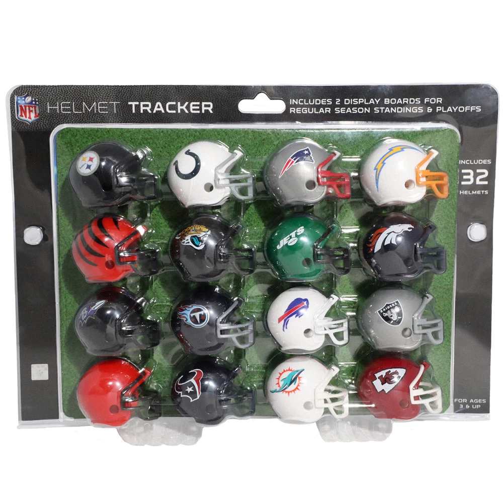 NFL Helmet Tracker Set is the perfect way to display your pride. The set included 32 team helmets, 2 display boards for regular season standing. Flip the board over and track the standings.